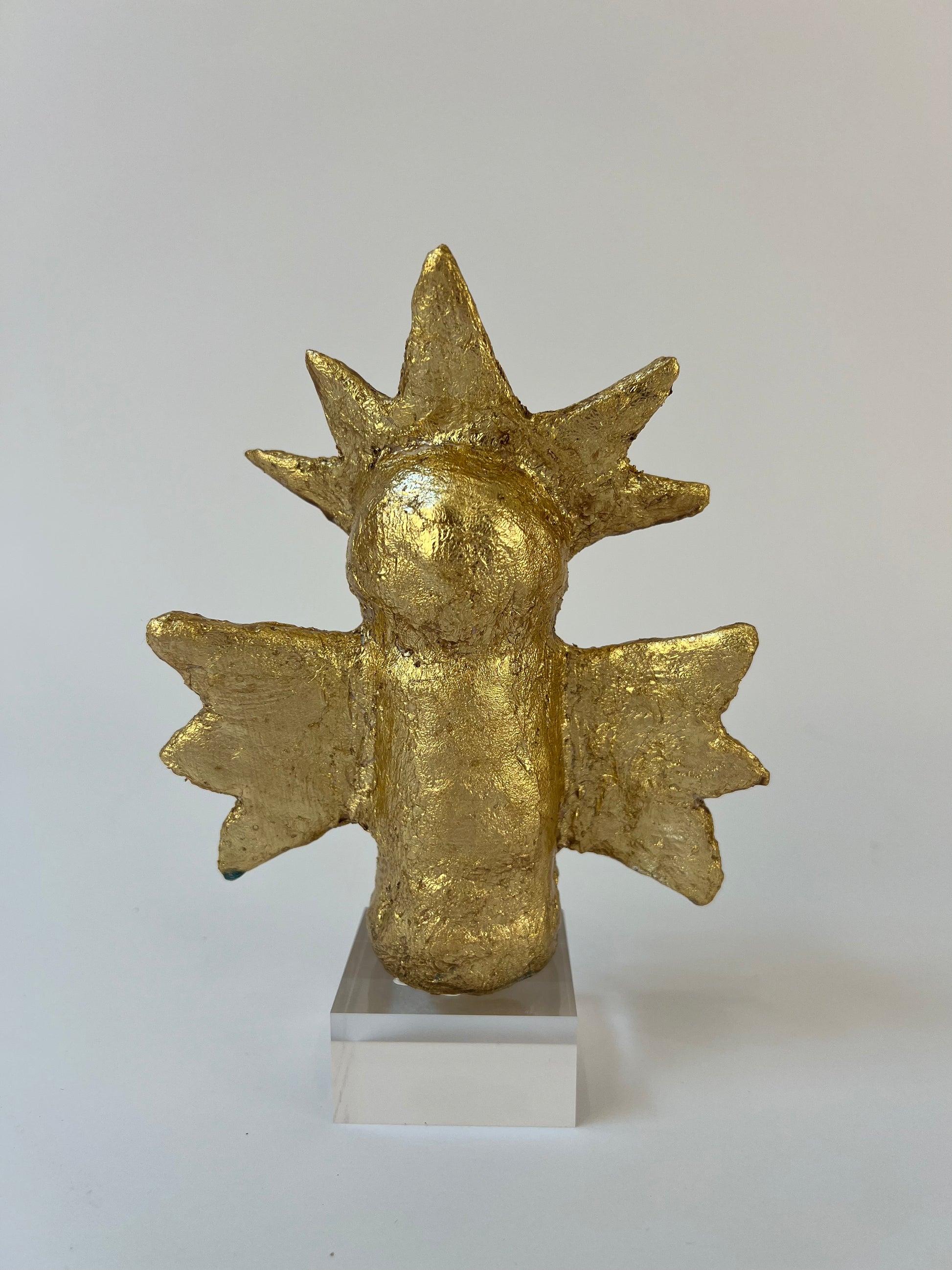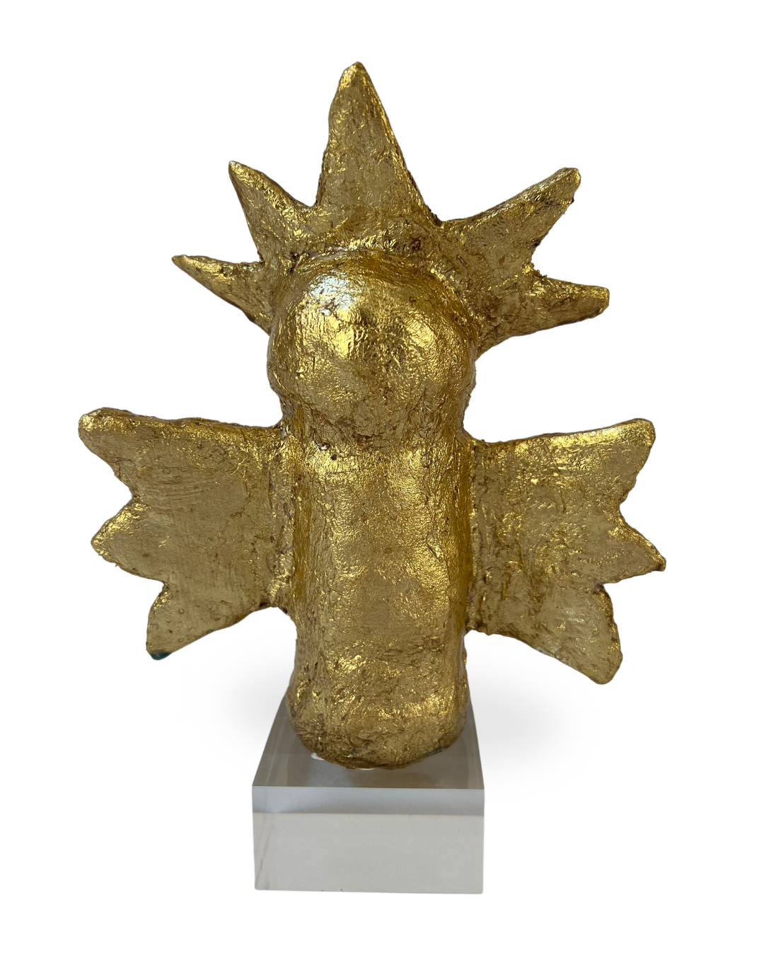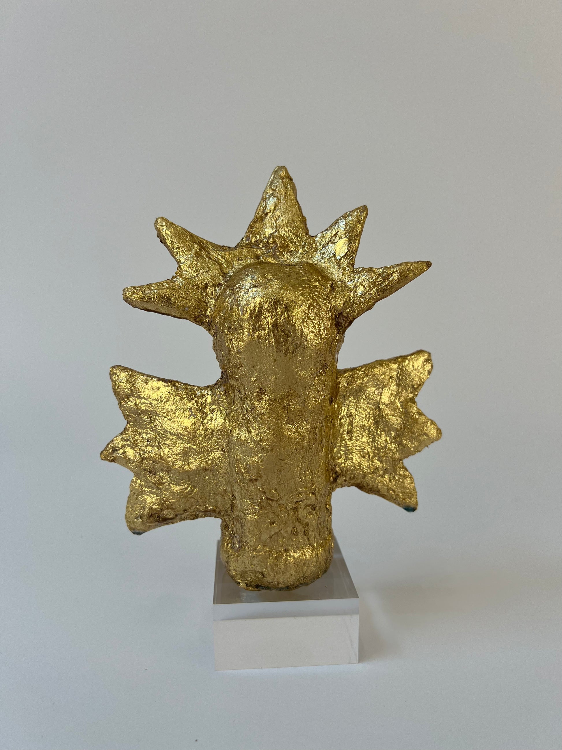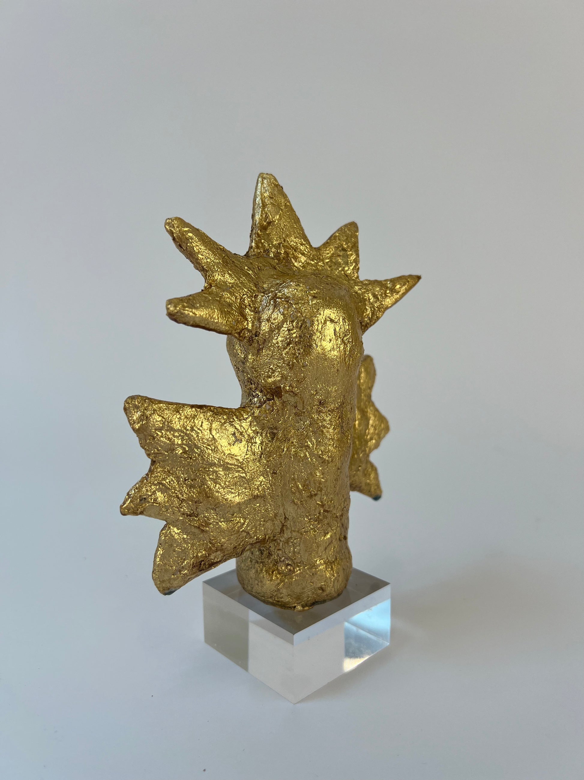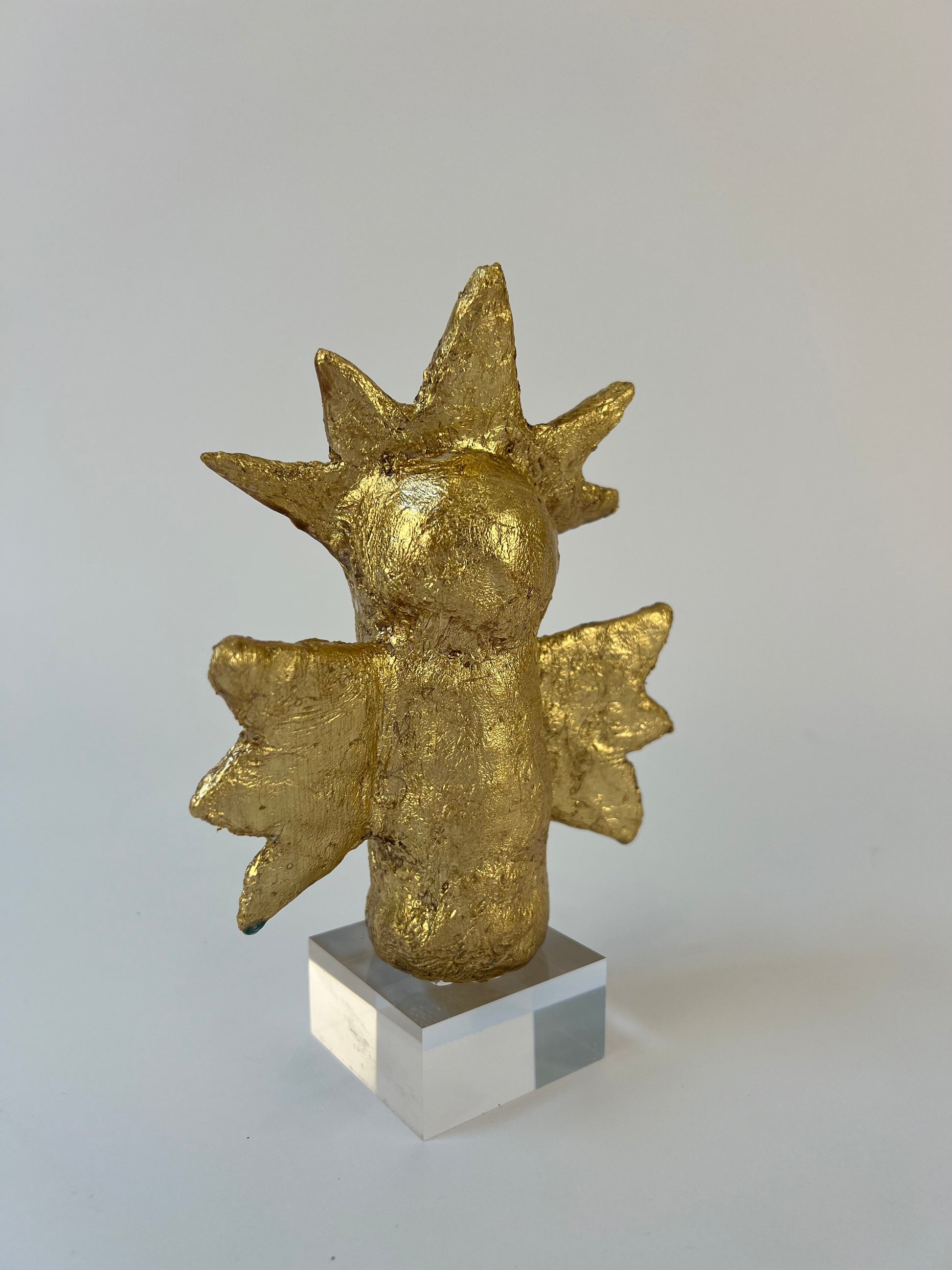 This is a one-of-a-kind gilded sculpture, built on an armature of recycled material. Finished in gold leaf and set on a clear lucite base.