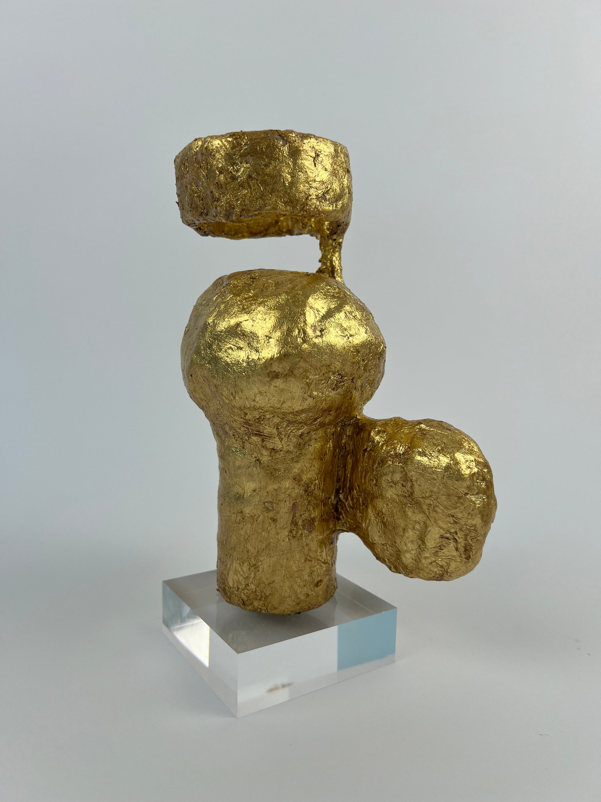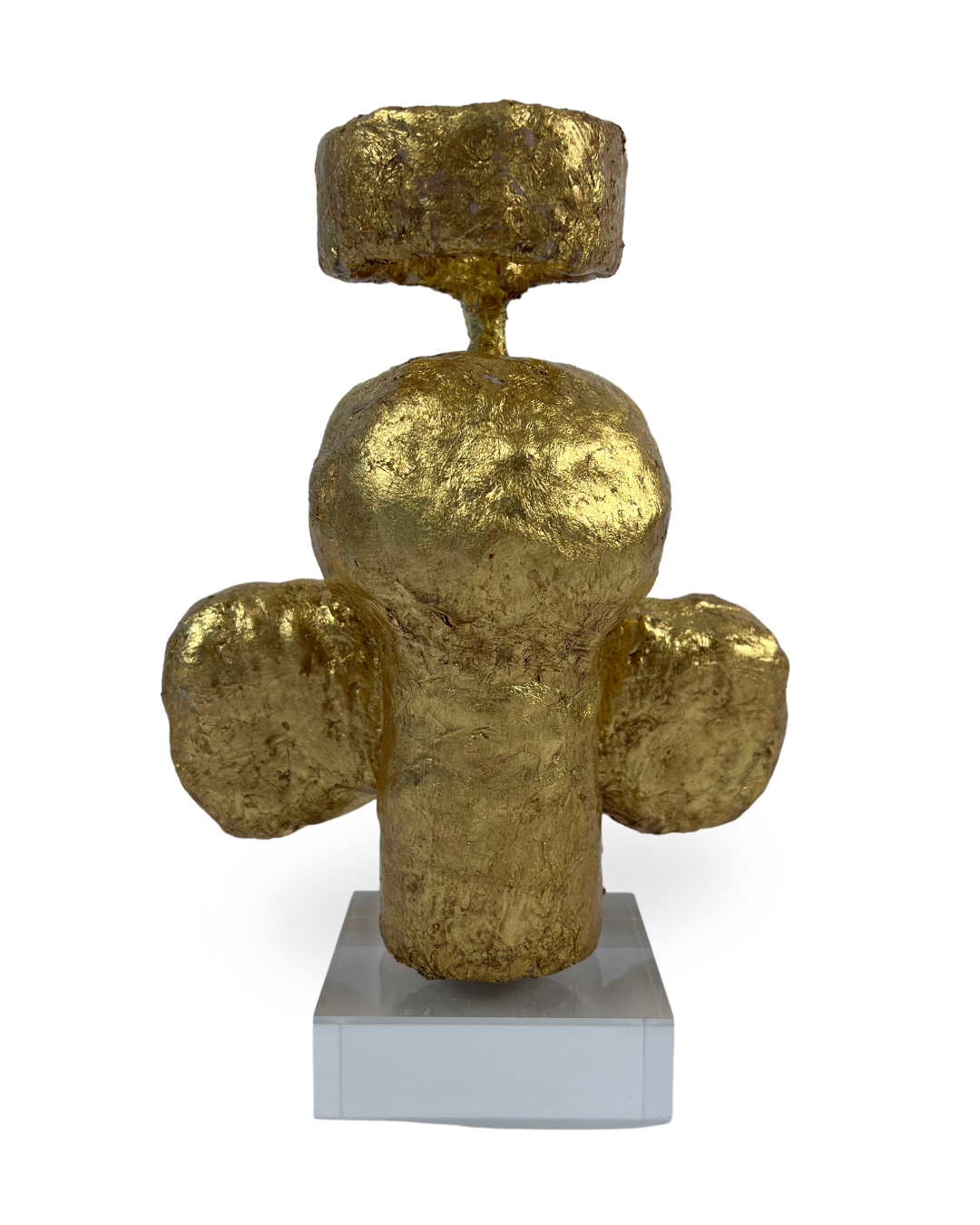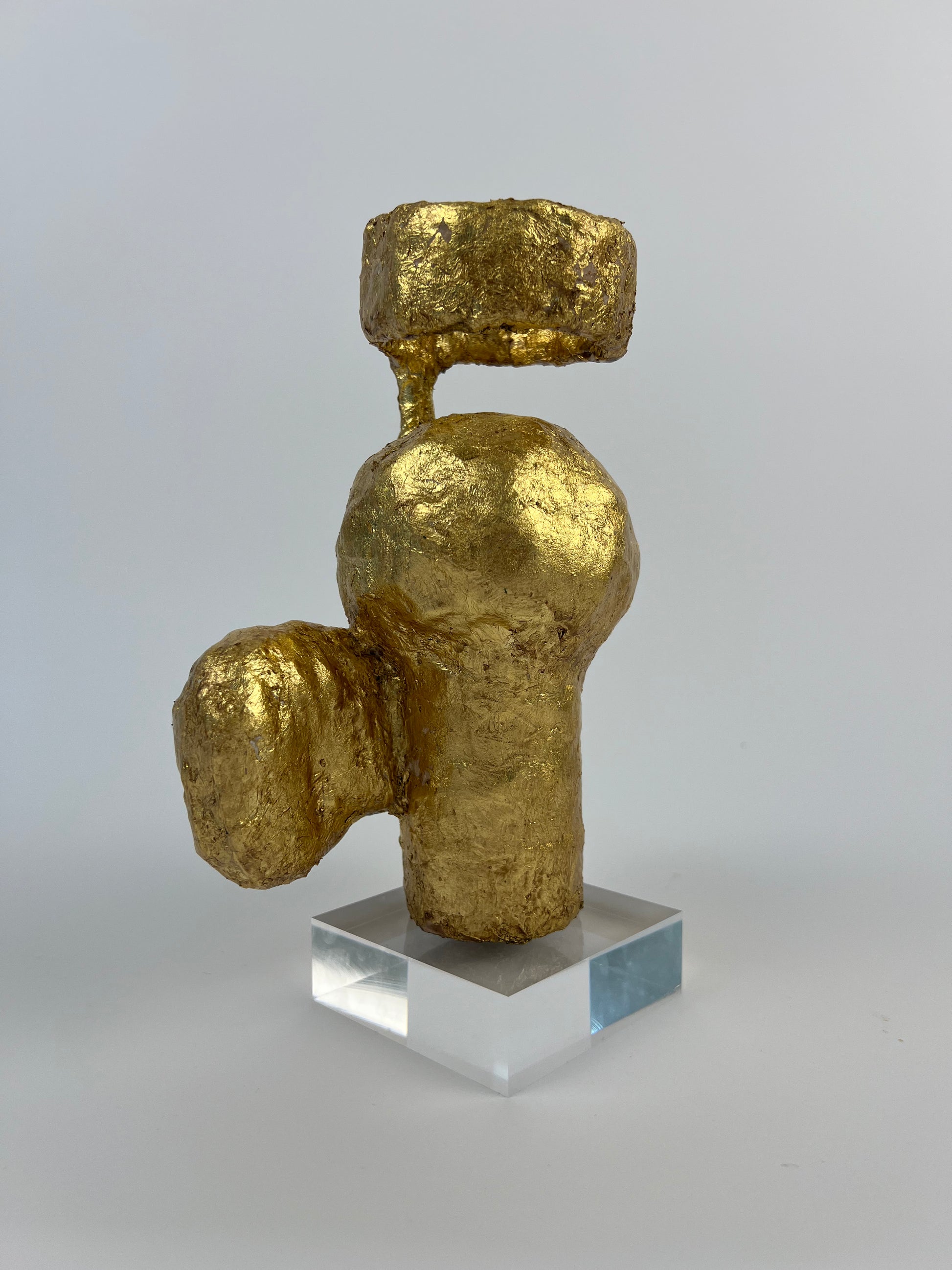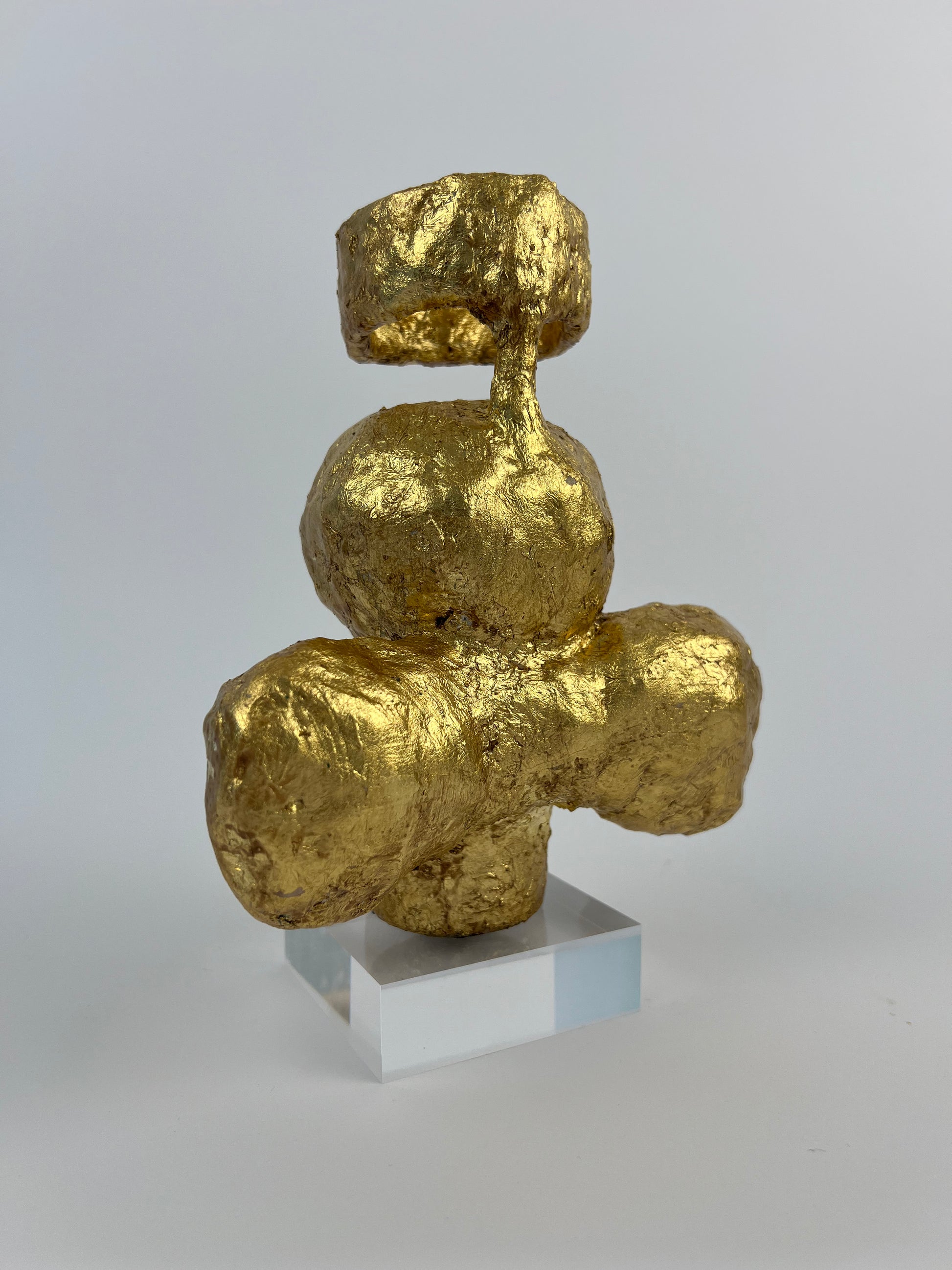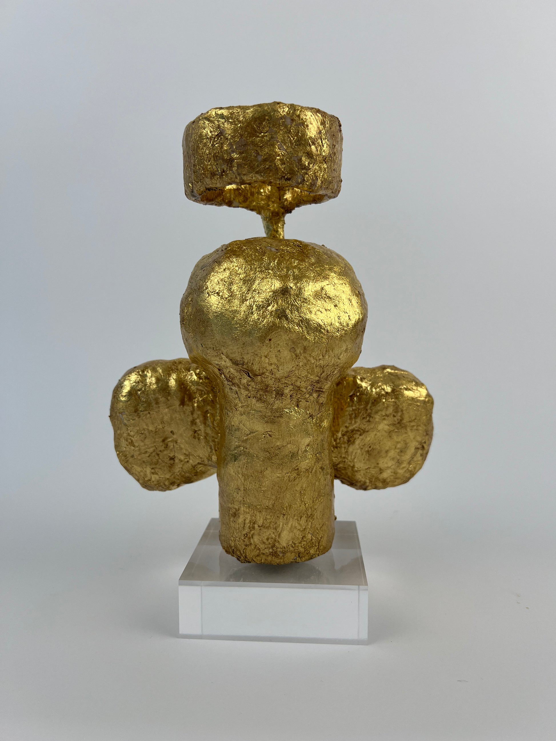 This is a one-of-a-kind gilded sculpture, built on an armature of recycled material. Finished in gold leaf and set on a clear lucite base.