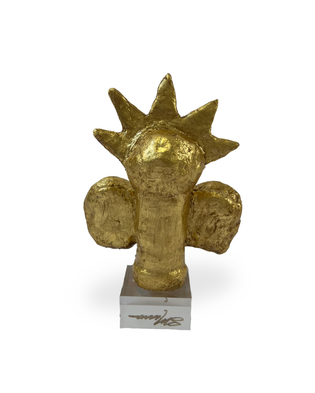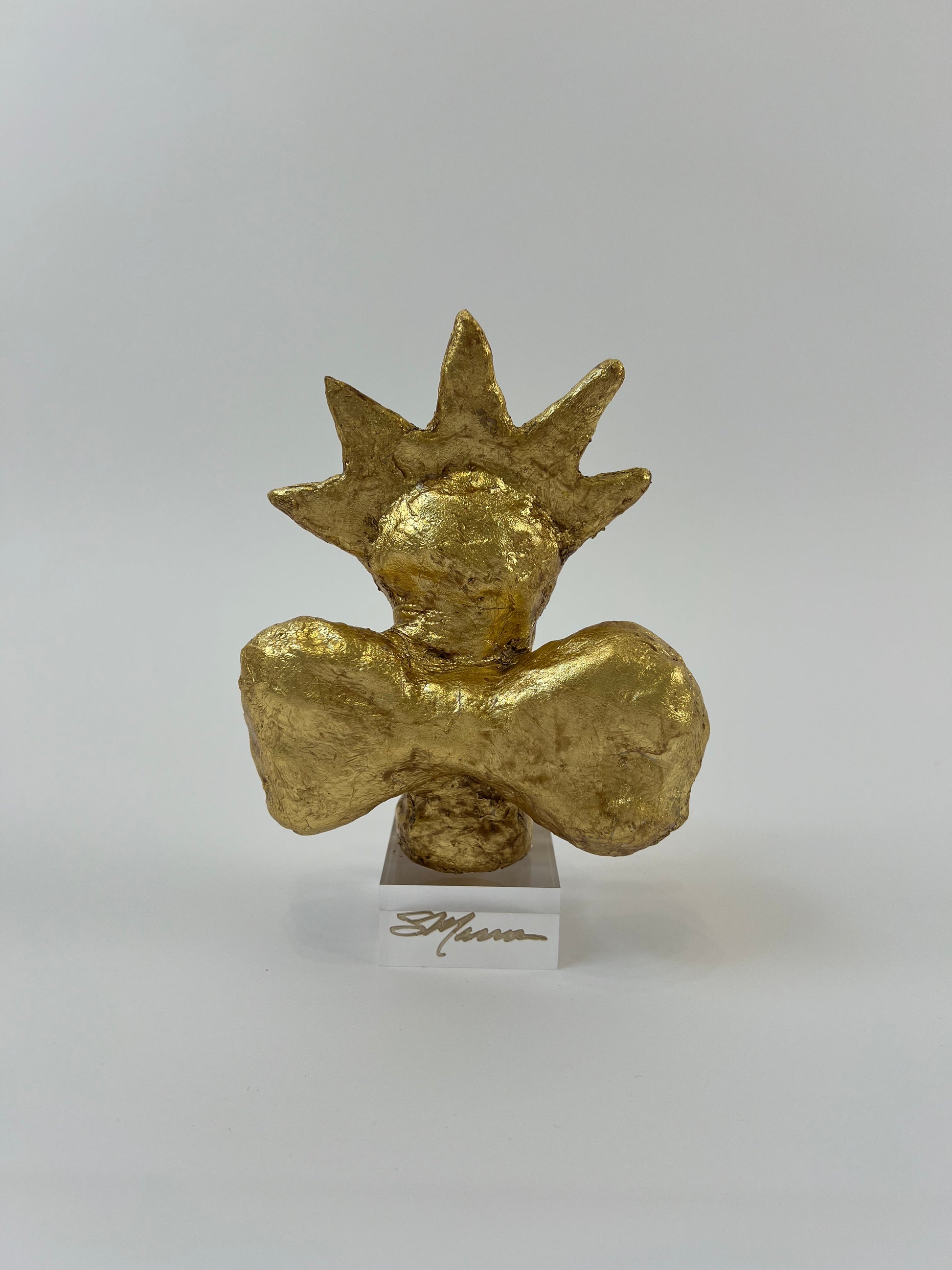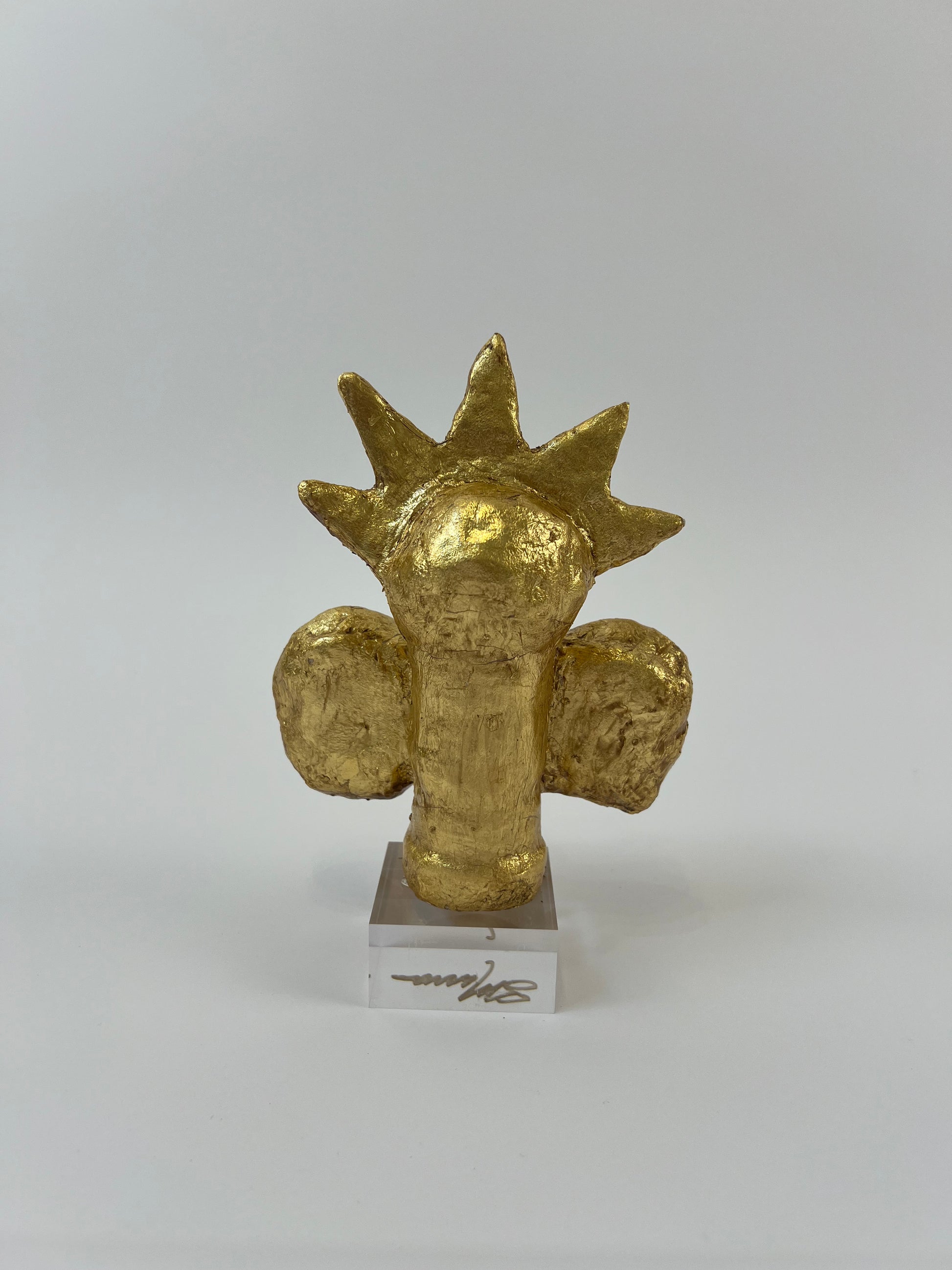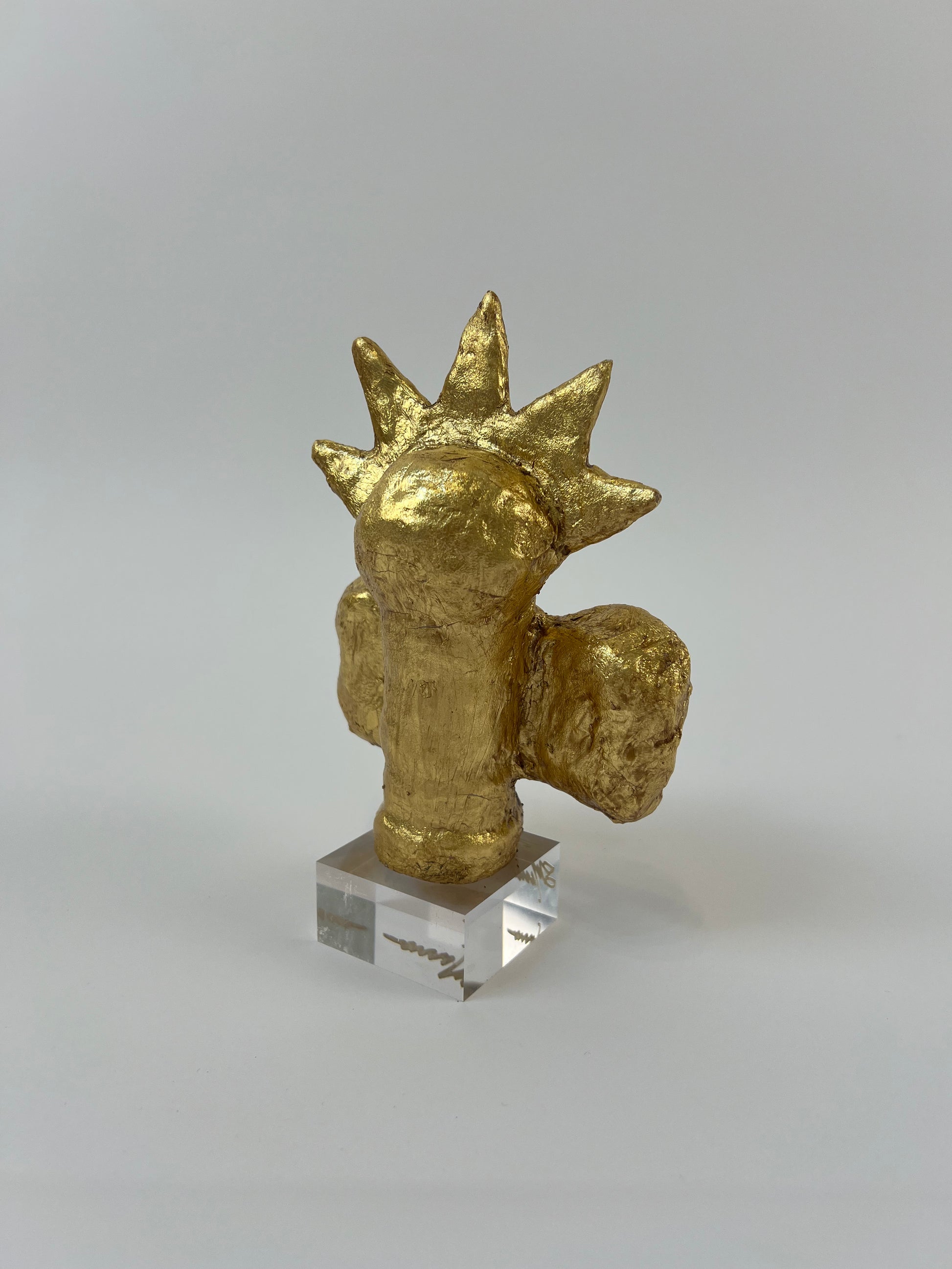 This is a one-of-a-kind gold metal leaf gilded sculpture, built on an armature of recycled material and set on a clear lucite base.