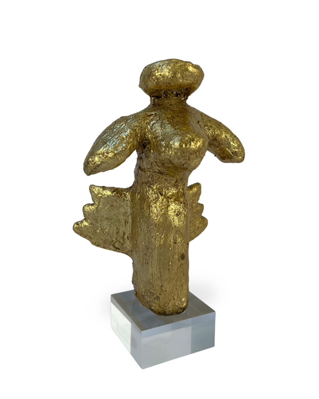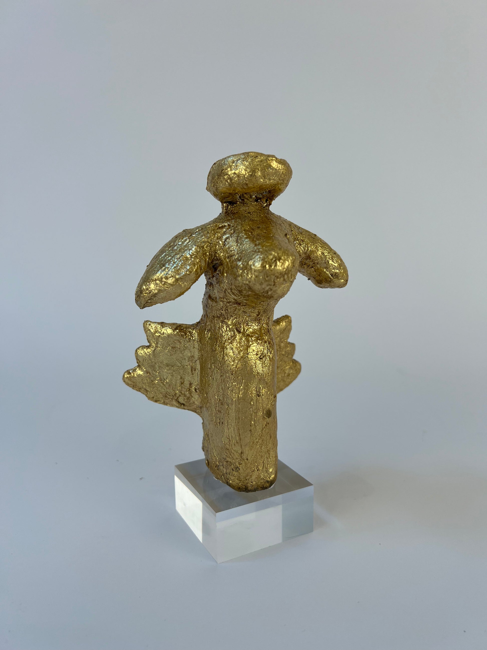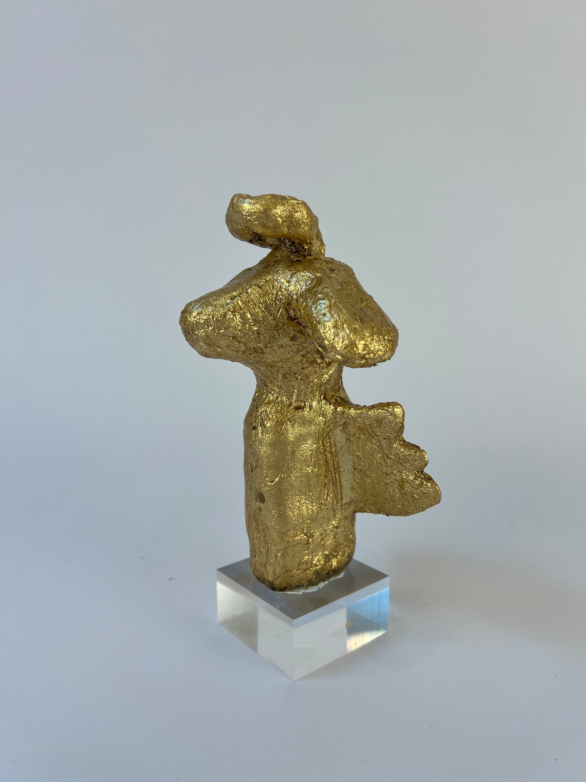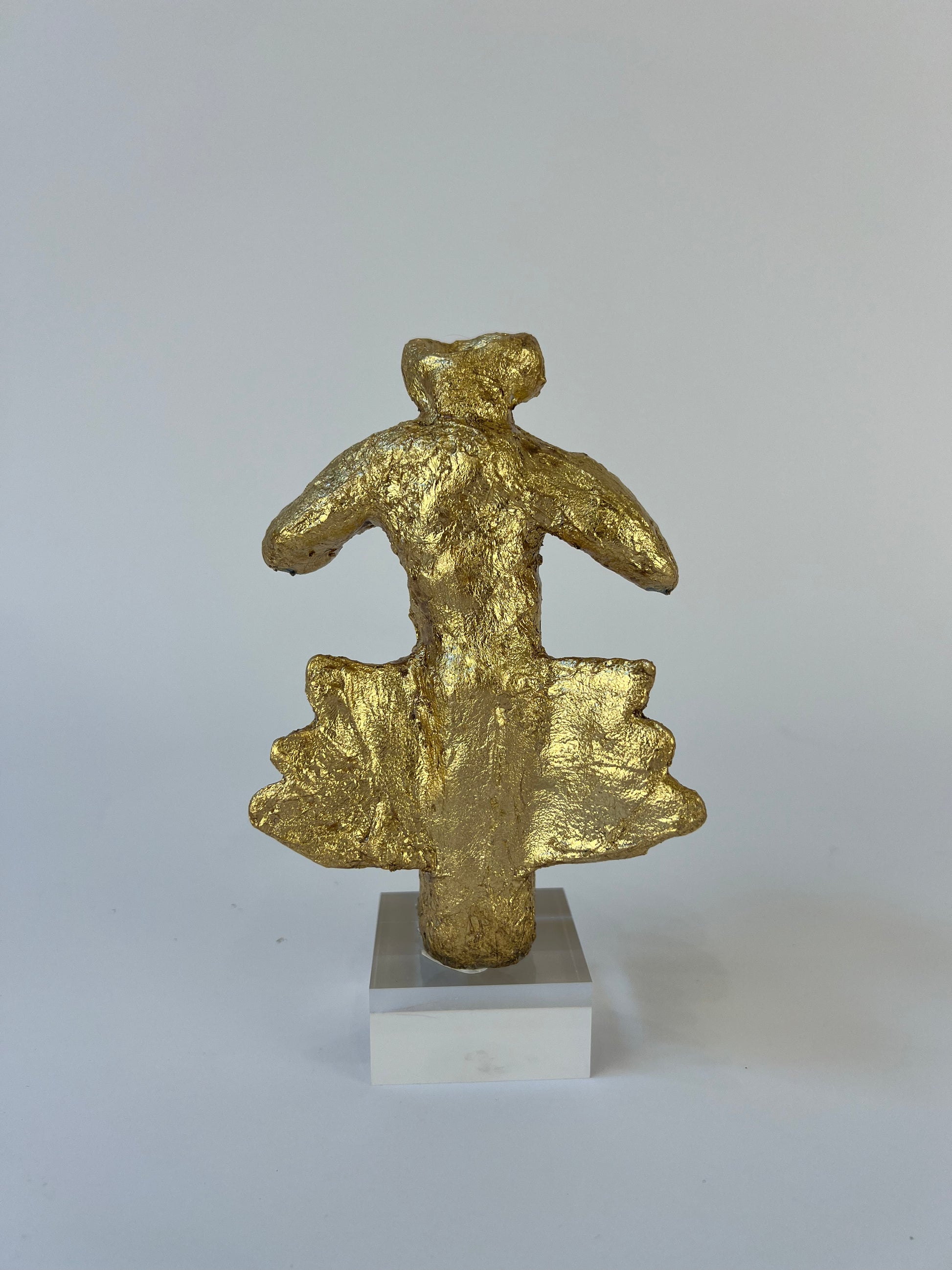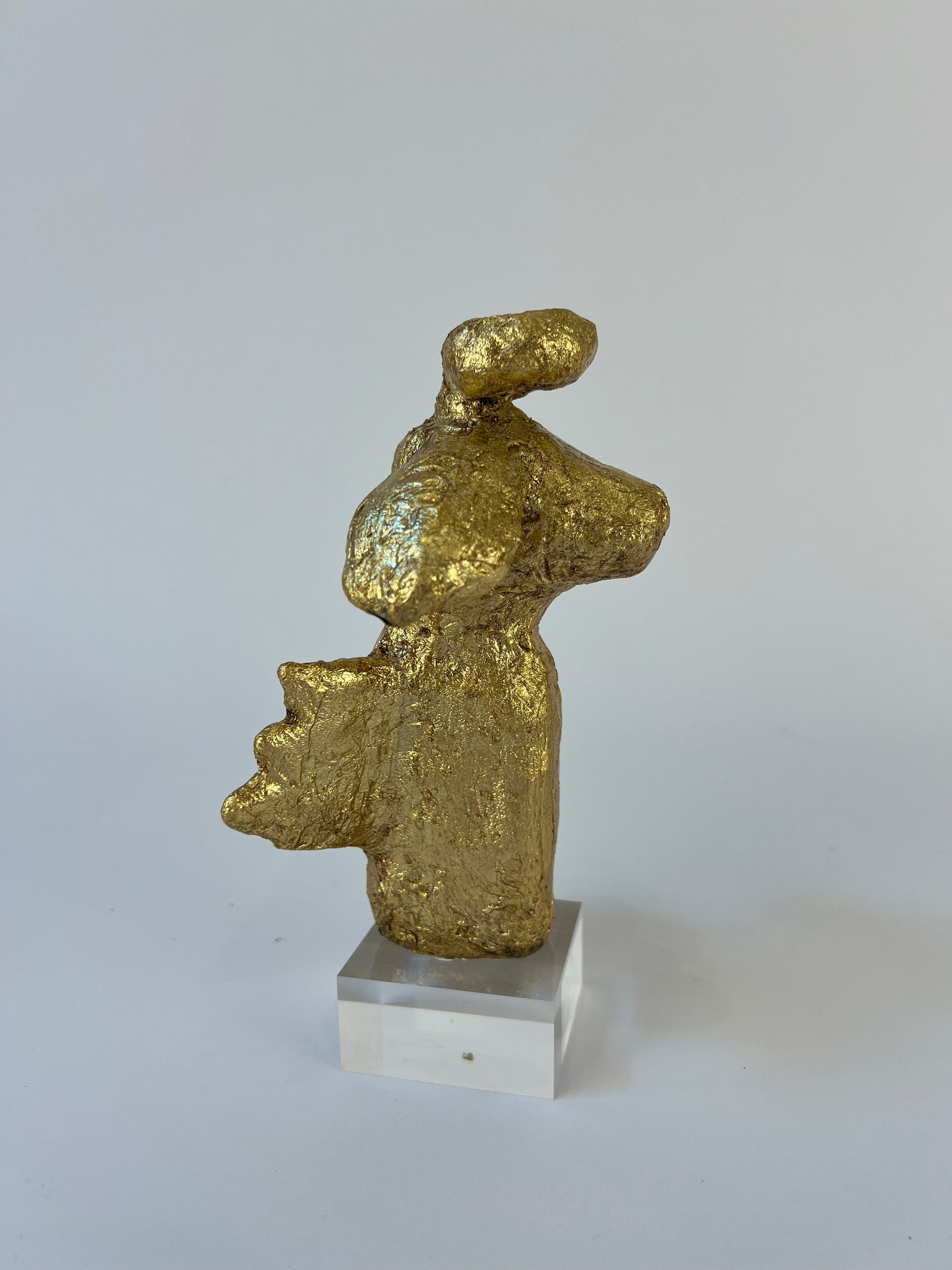 This is a one-of-a-kind gilded sculpture, built on an armature of recycled material. Finished in gold leaf and set on a clear lucite base.