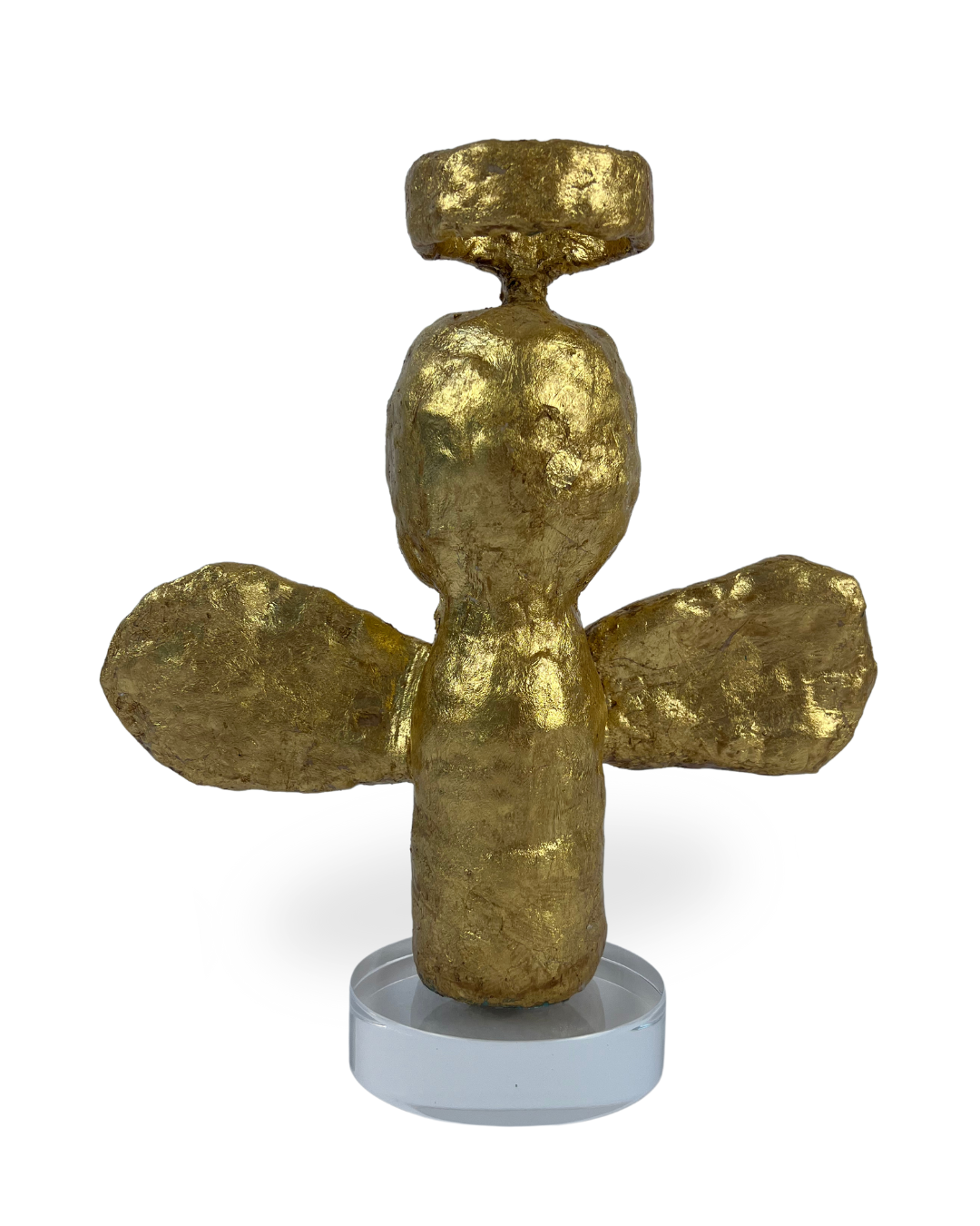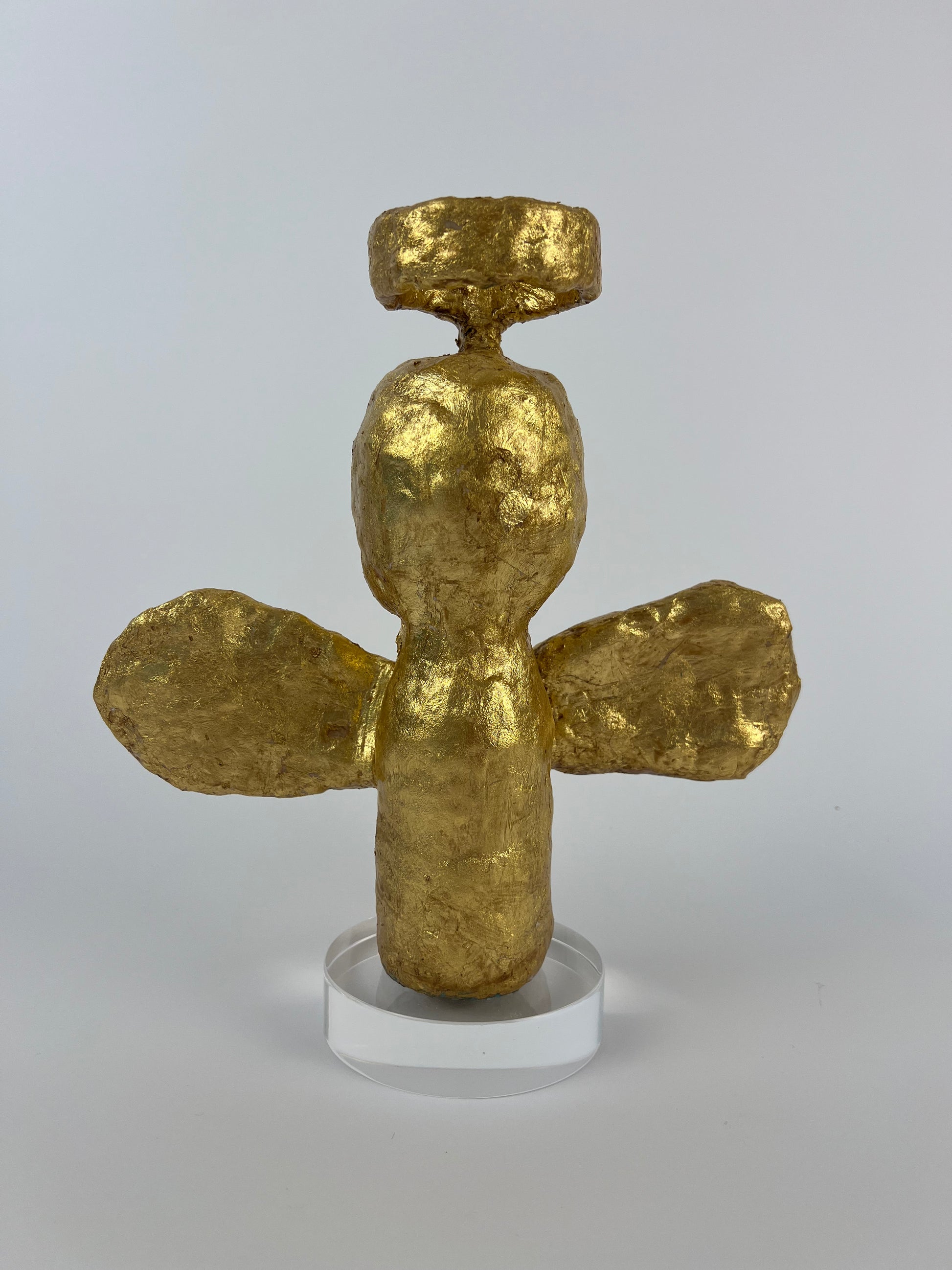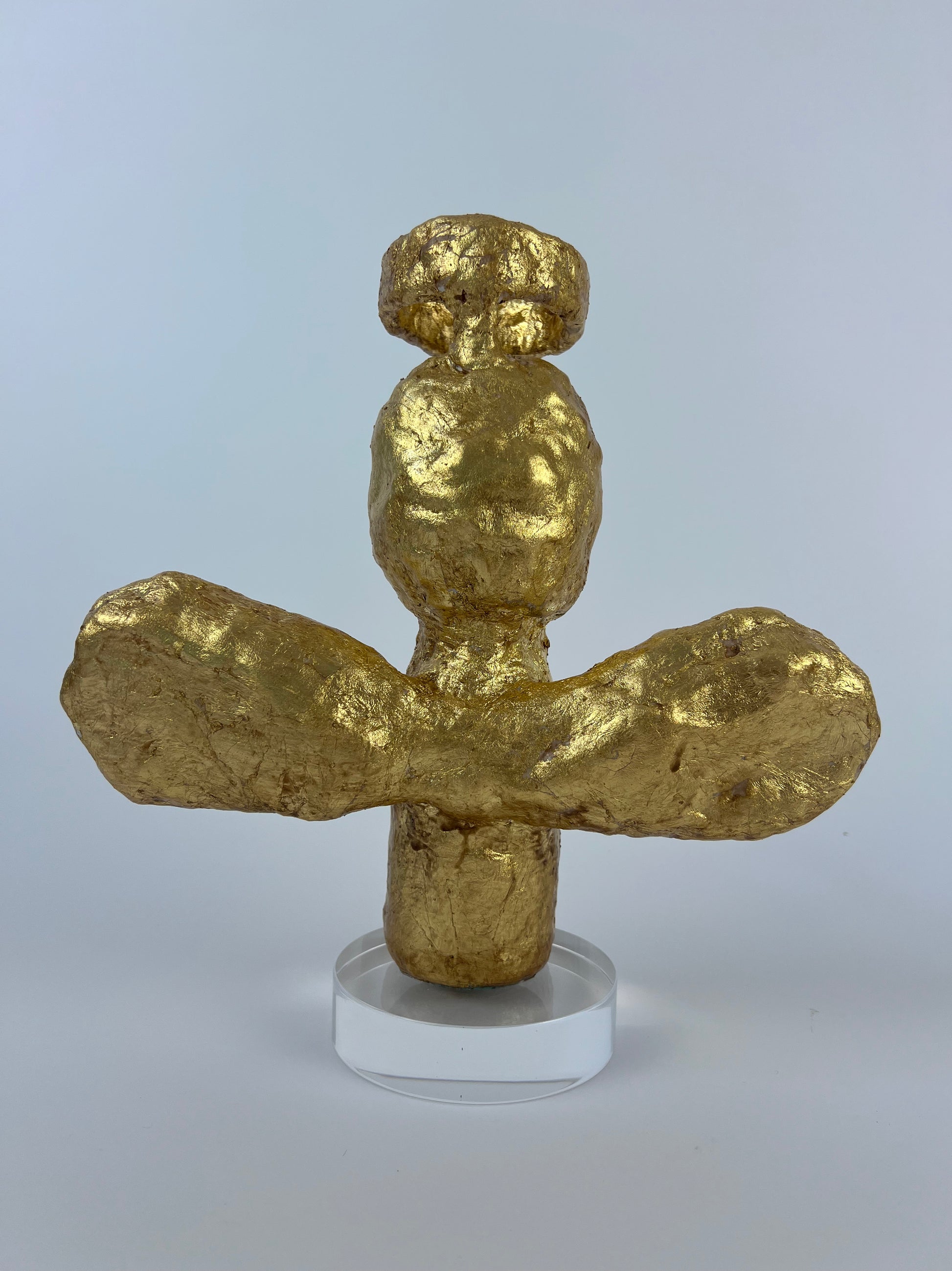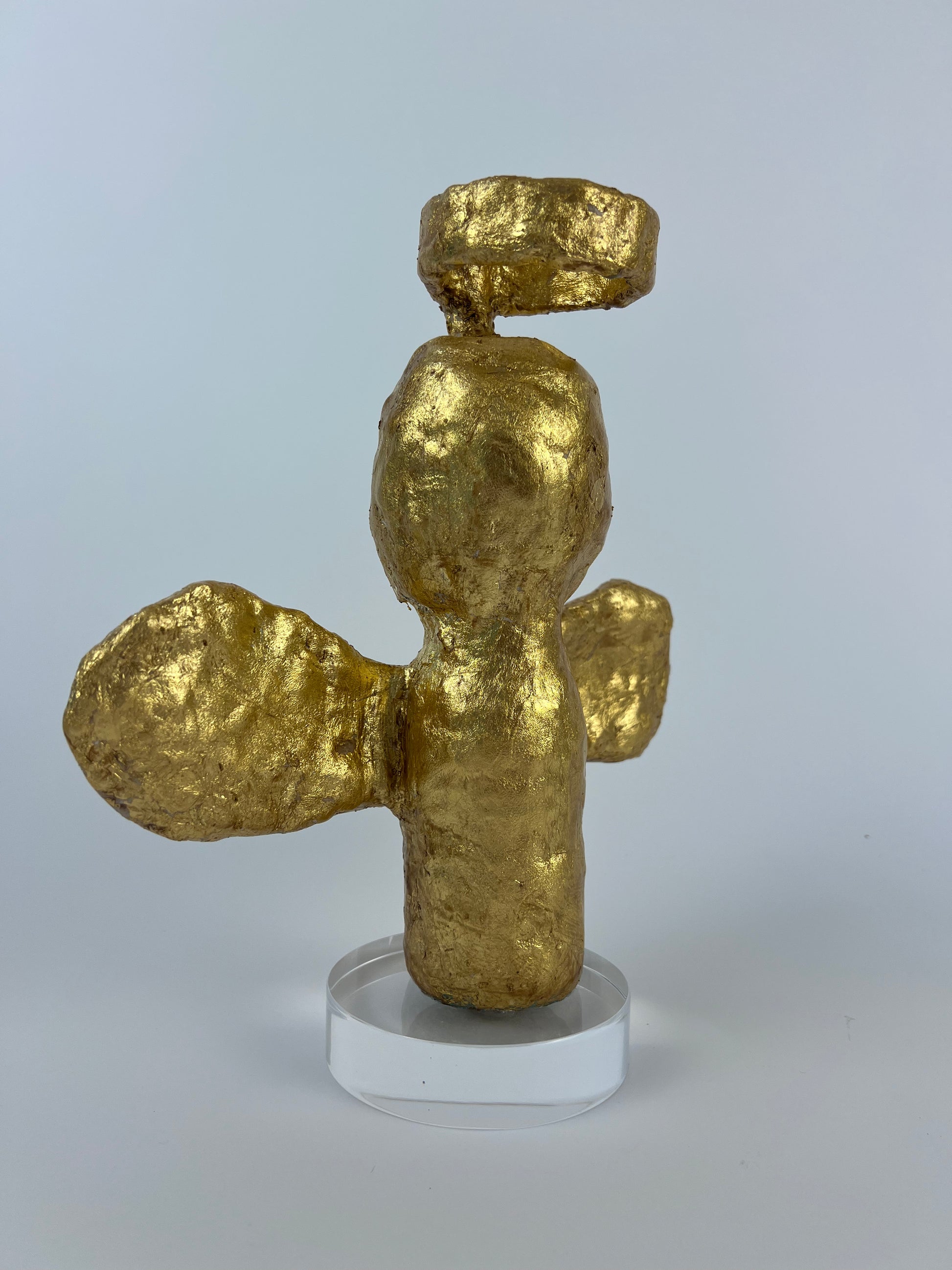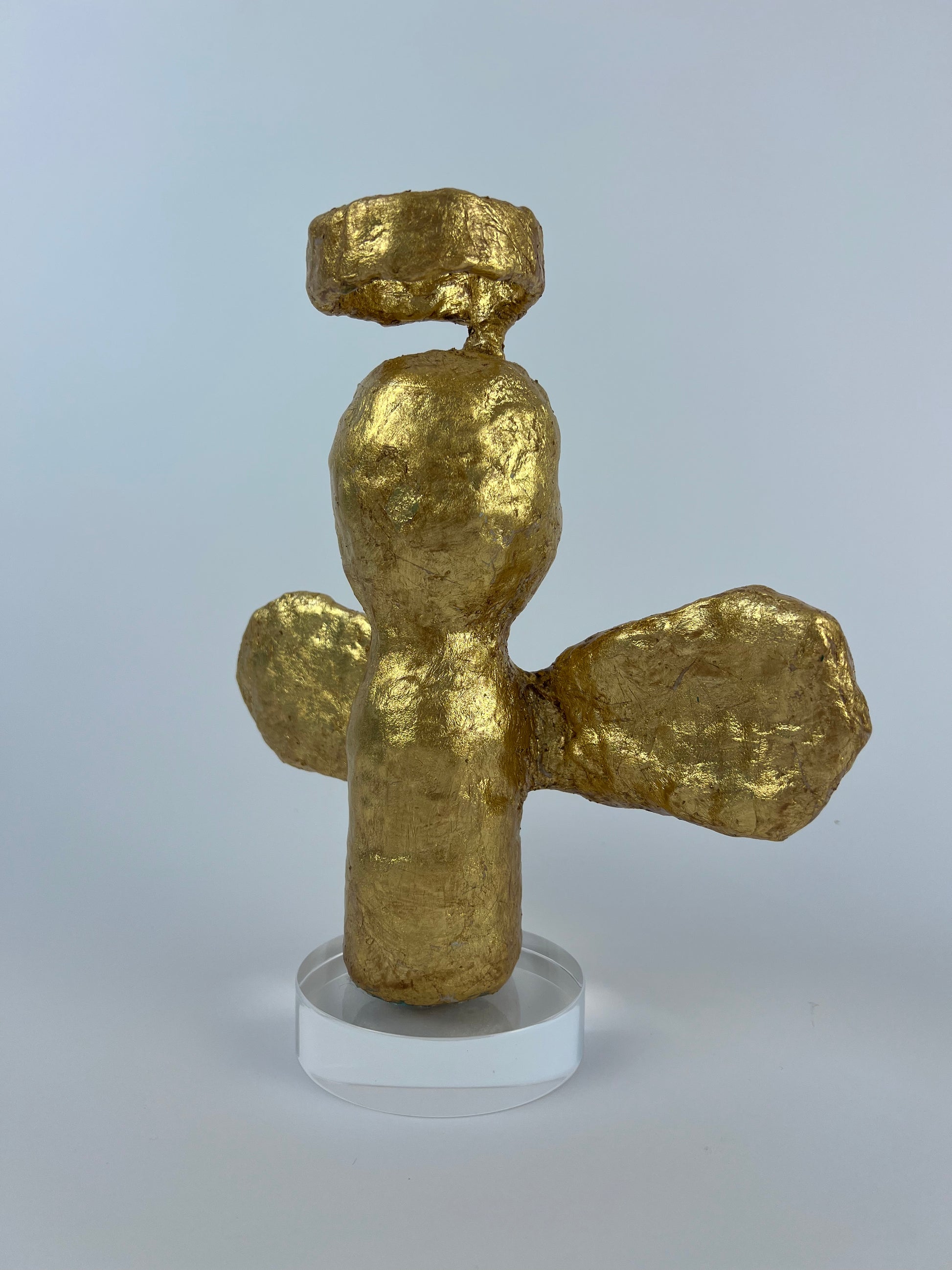 This is a one-of-a-kind gilded sculpture, built on an armature of recycled material. Finished in gold leaf and set on a clear lucite base.