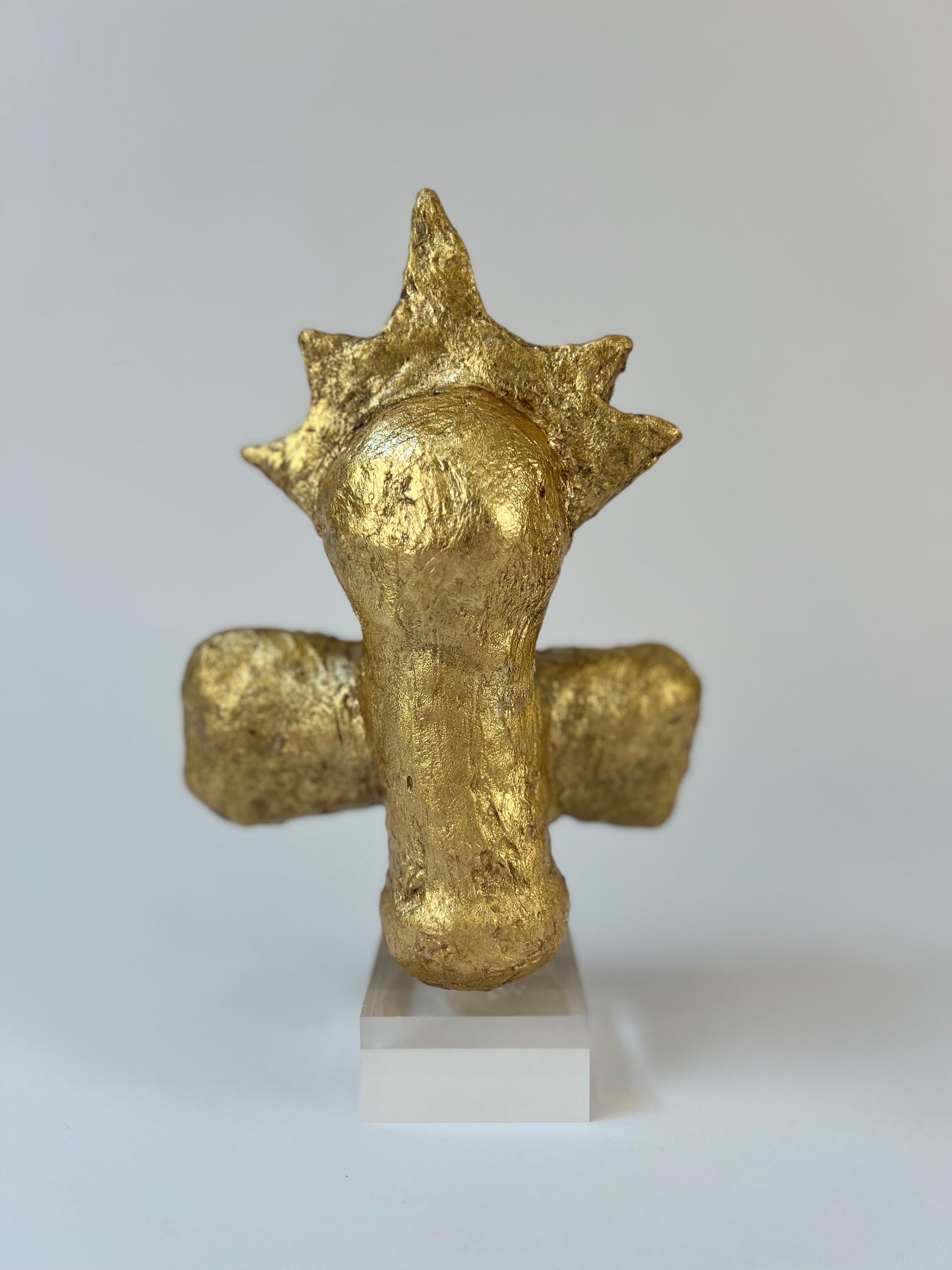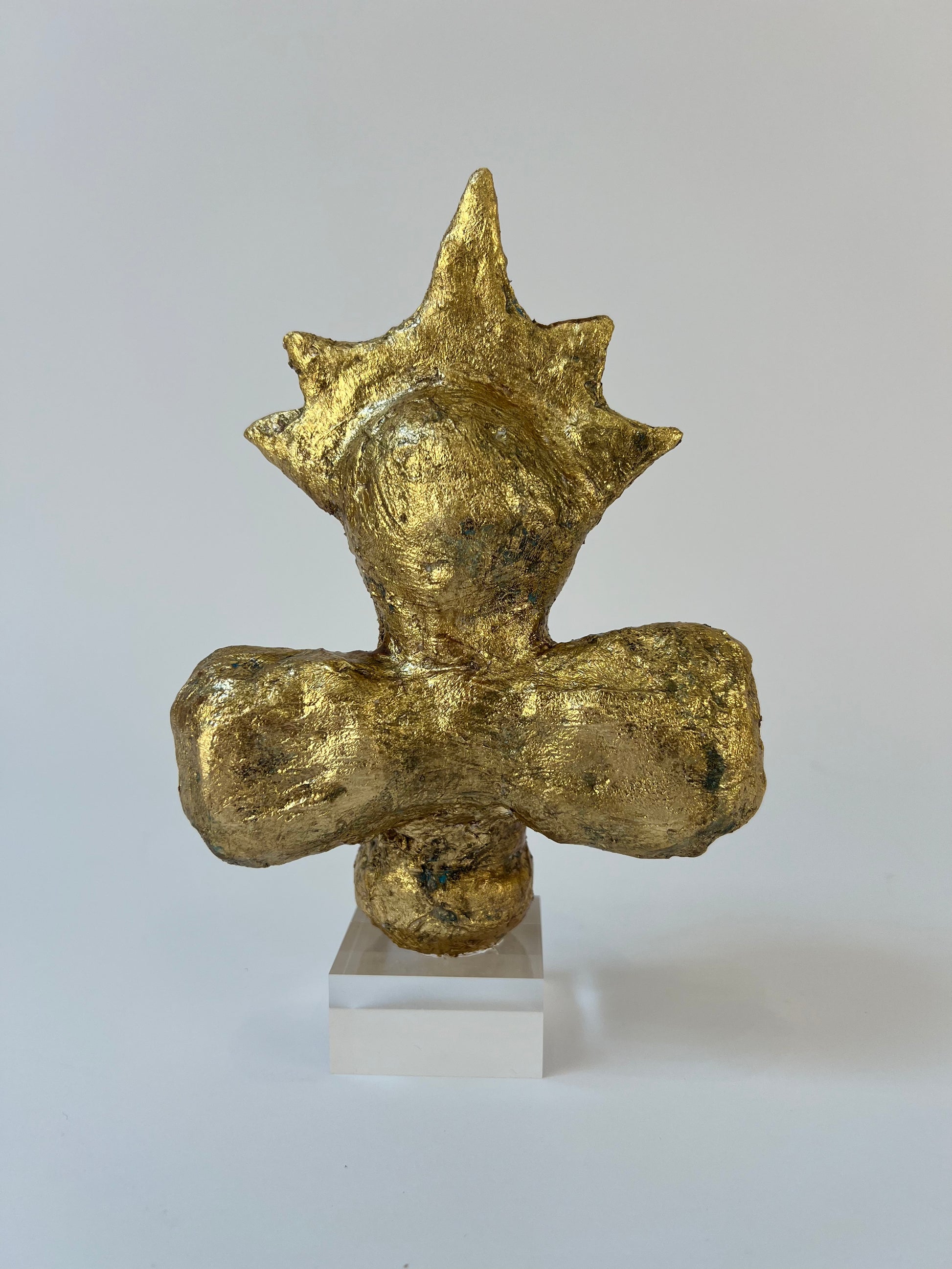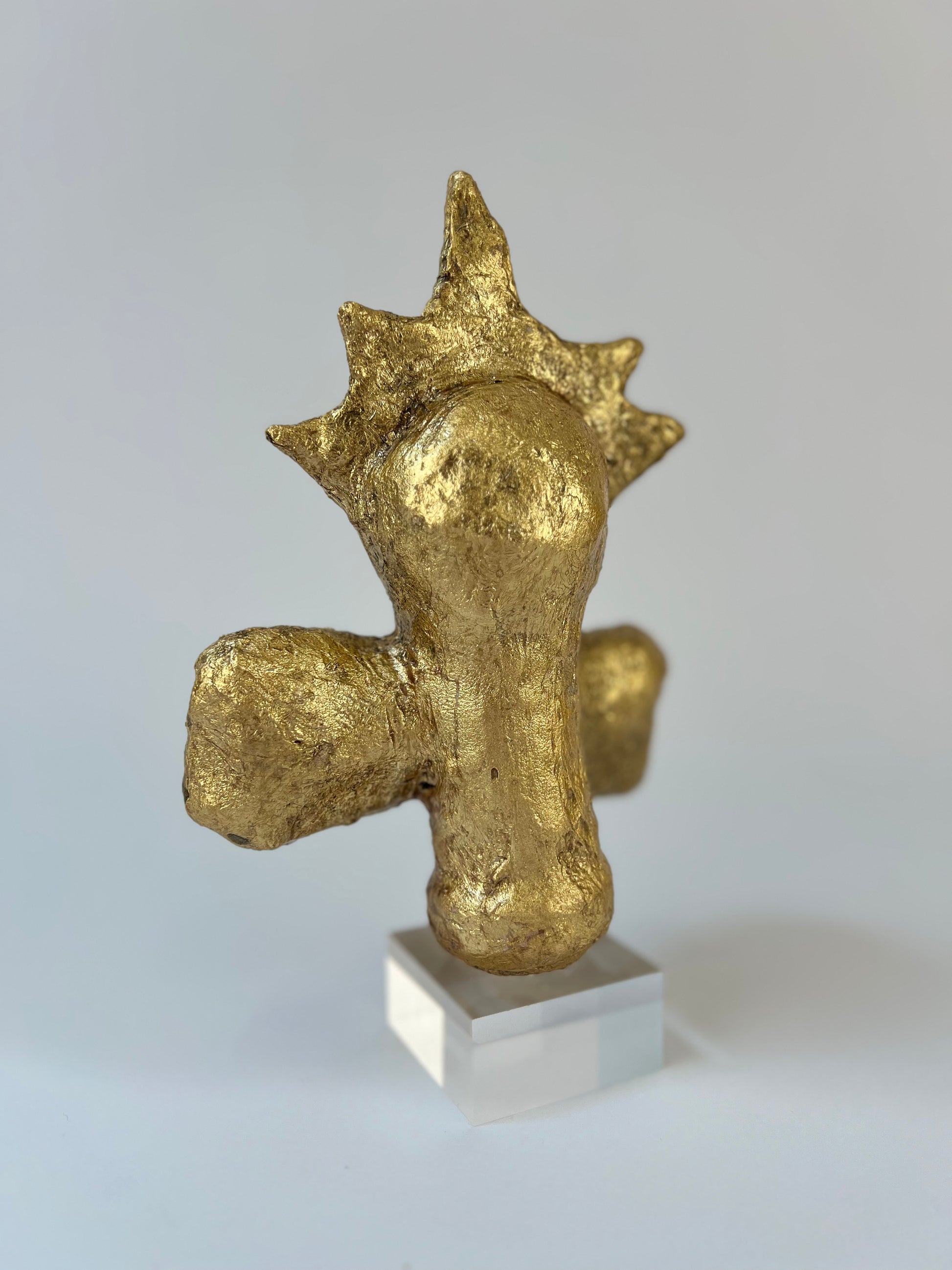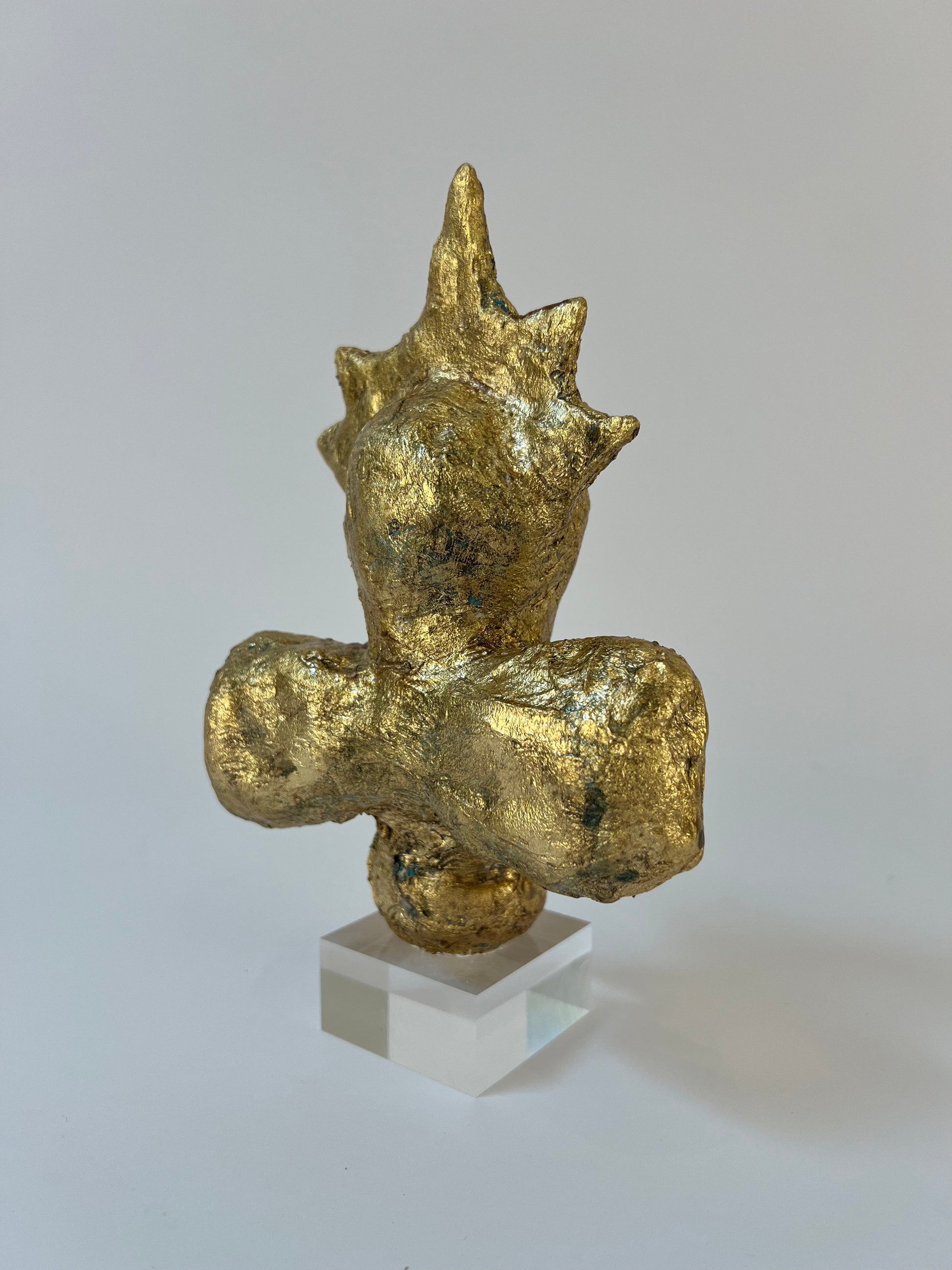 This is a one-of-a-kind gilded sculpture, built on an armature of recycled material. Finished in gold leaf and set on a clear lucite base.