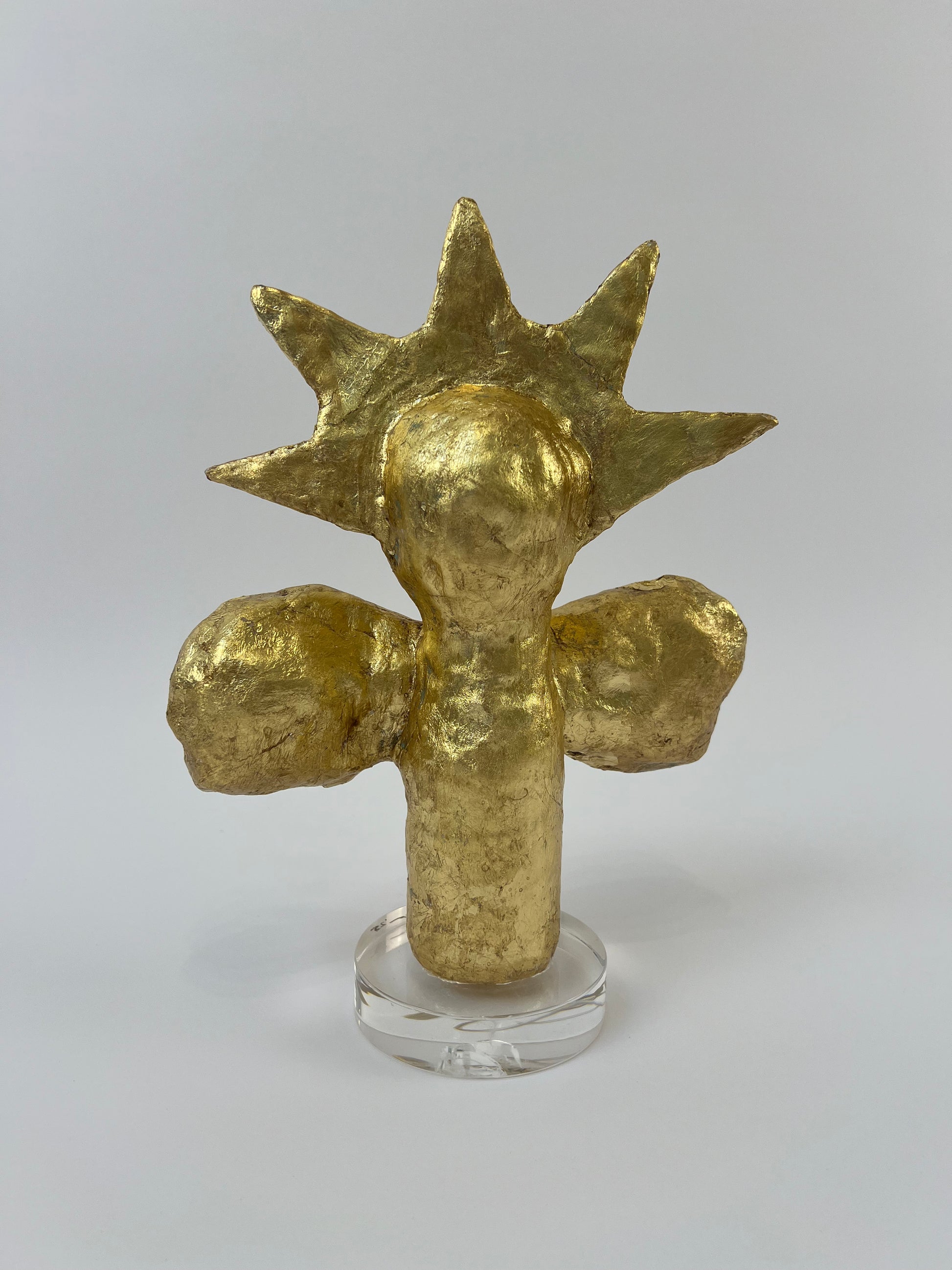 This is a one-of-a-kind gold metal leaf gilded sculpture, built on an armature of recycled material and set on a clear lucite base.
